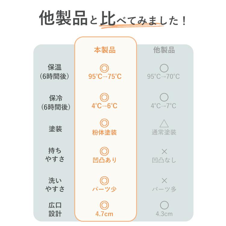 ※保温効力とは、室温20度±2度において製品に95度±1度の熱湯をフタ栓下端まで満たし、24時間及び6時間放置した場合におけるその湯の温度。