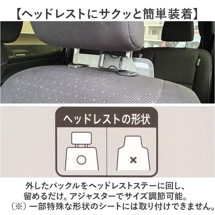 ・外したバックルをヘッドレストステーに回し、留めるだけ。アジャスターでサイズ調節可能。
