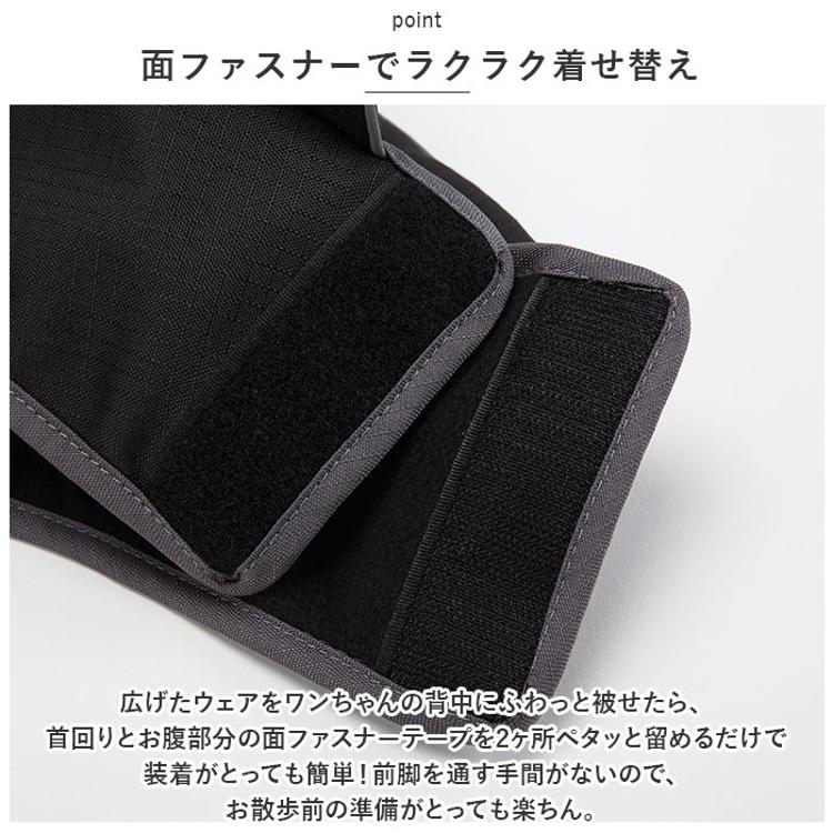 ・広げたウェアをワンちゃんの背中にふわっと被せたら、首回りとお腹部分の面ファスナーテープを2ヶ所ペタッと留めるだけで装着がとっても簡単!前脚を通す手間がないので、お散歩前の準備がとっても楽ちん。