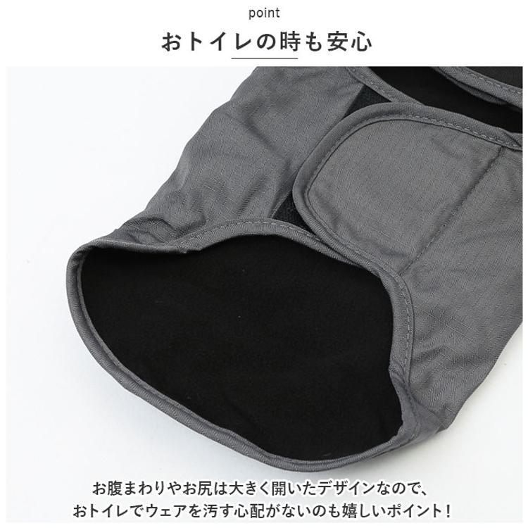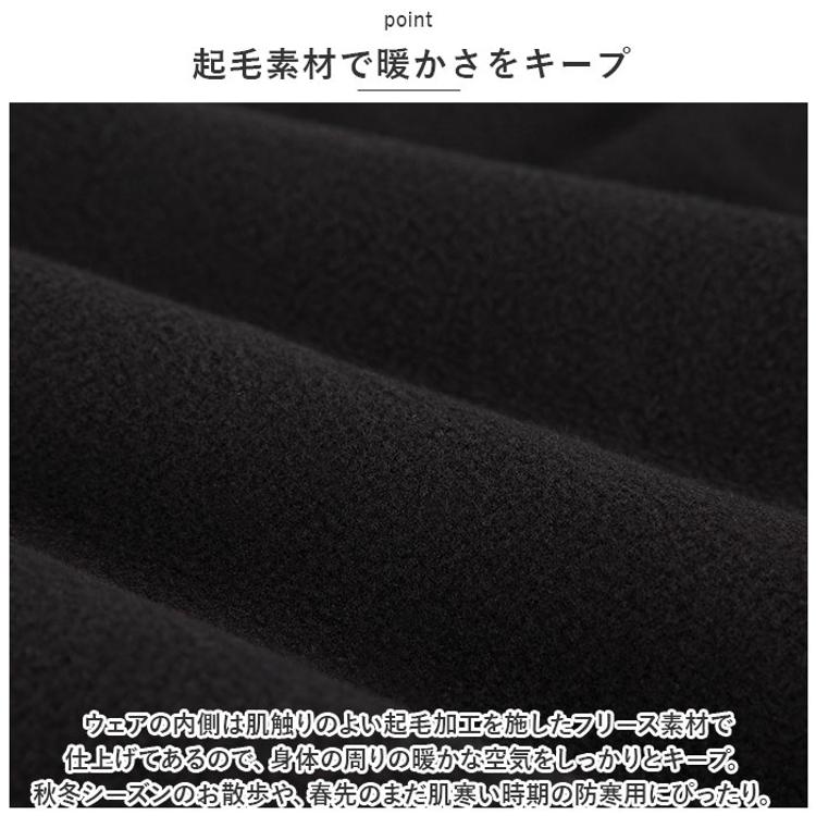 ・ウェアの内側は肌触りのよい起毛加工を施したフリース素材で仕上げてあるので、身体の周りの暖かな空気をしっかりとキープ。秋冬シーズンのお散歩や、春先のまだ肌寒い時期の防寒用にぴったり。
