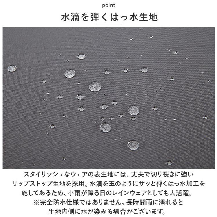 ・スタイリッシュなウェアの表生地には、丈夫で切り裂きに強いリップストップ生地を採用。水滴を玉のようにサッと弾くはっ水加工を施してあるため、小雨が降る日のレインウェアとしても大活躍。(※完全防水仕様ではありません。長時間雨に濡れると生地内側に水が染みる場合がございます。)