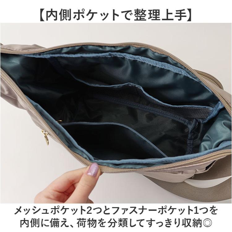 ・メッシュポケット2つとファスナーポケット1つを内側に備え、荷物を分類してすっきり収納◎