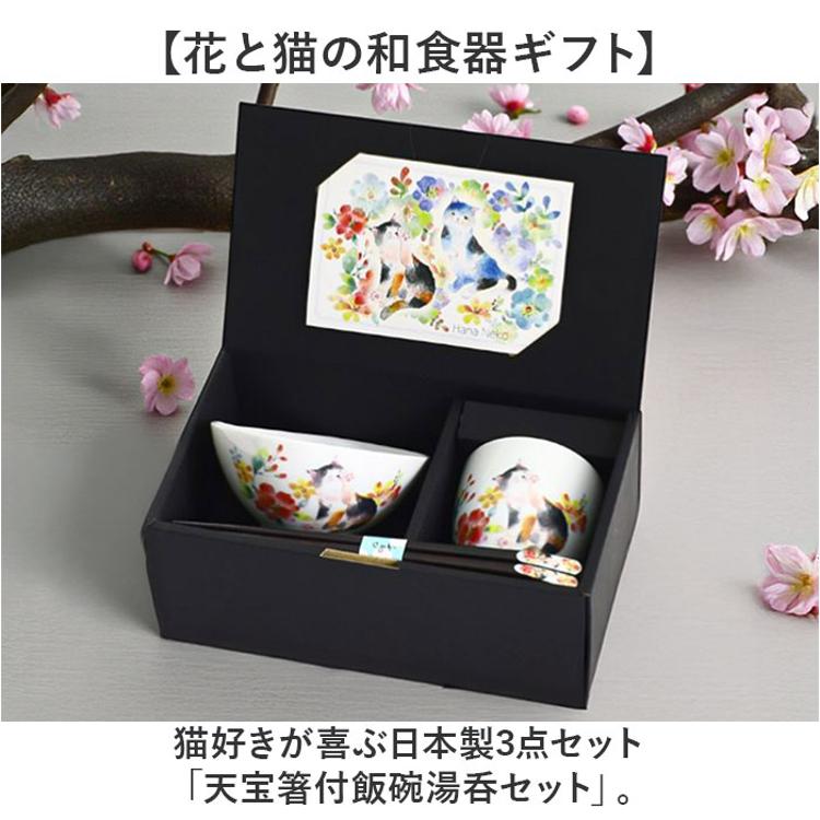 ・猫好きが喜ぶ日本製3点セット「天宝箸付飯碗湯呑セット」。