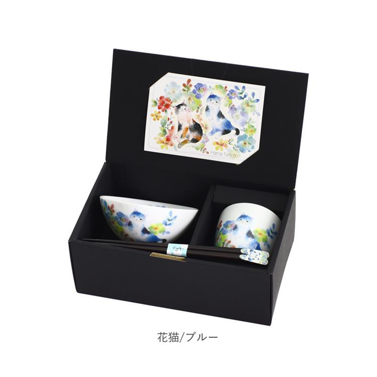 茶碗 セット 通販 日本製 飯碗 湯呑み お茶碗 お箸 ご飯茶碗 箸付き 箸 和食器 食器 セラミック藍 花猫 ネコ ねこ ギフト 贈り物 母の日 女性 誕生日 結婚記念日 両親 還暦祝い 可愛い