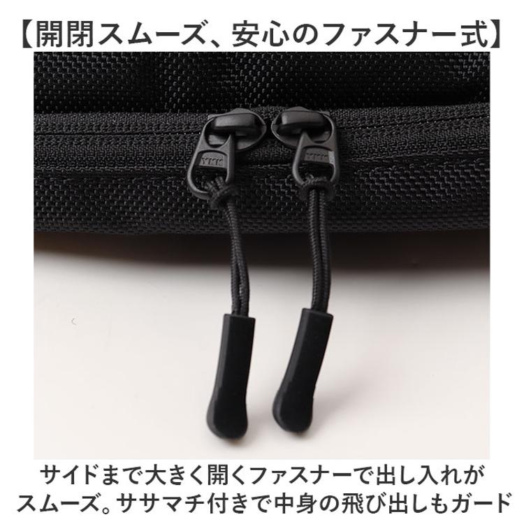 ・サイドまで大きく開くファスナーで出し入れがスムーズ。ササマチ付きで中身の飛び出しもガード