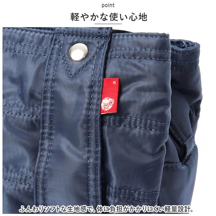 ・内側はA5サイズやペットボトルが横向きにすっぽり。コスメポーチや長財布なども収納可能。横幅のある内ポケット付き。