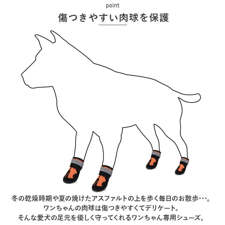 ・冬の乾燥時期や夏の焼けたアスファルトの上を歩く毎日のお散歩・・・。ワンちゃんの肉球は傷つきやすくてデリケート。そんな愛犬の足元を優しく守ってくれるワンちゃん専用シューズ。