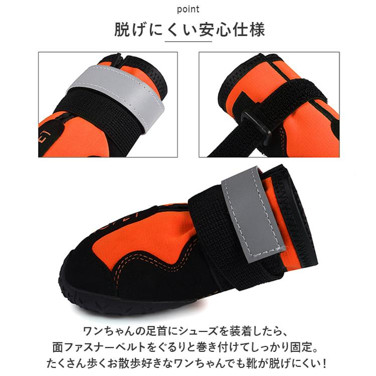 ・ワンちゃんの足首にシューズを装着したら、面ファスナーベルトをぐるりと巻き付けてしっかり固定。たくさん歩くお散歩好きなワンちゃんでも靴が脱げにくい!