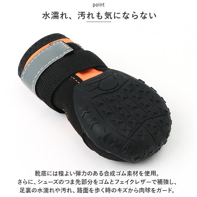 ・靴底には程よい弾力のある合成ゴム素材を使用。さらに、シューズのつま先部分をゴムとフェイクレザーで補強し、足裏の水濡れや汚れ、路面を歩く時のキズから肉球をガード。
