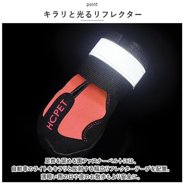 ・足首を留める面ファスナーベルトには、自動車のライトをキラリと反射する幅広リフレクターテープを配置。薄暗い雨の日や夜のお散歩もより安全に。