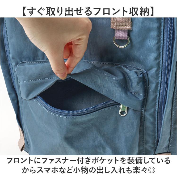 ・フロントにファスナー付きポケットを装備しているからスマホなど小物の出し入れも楽々◎