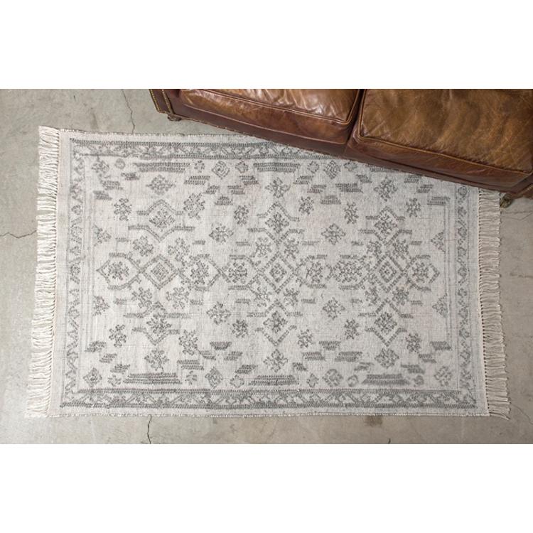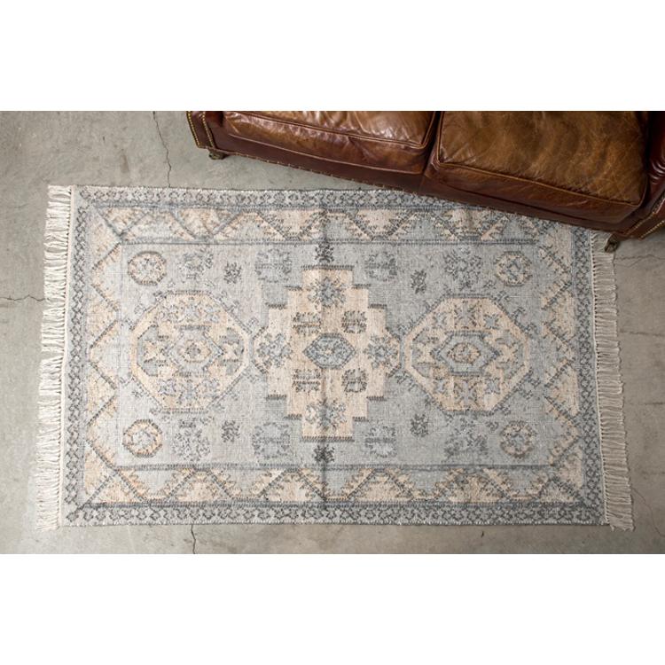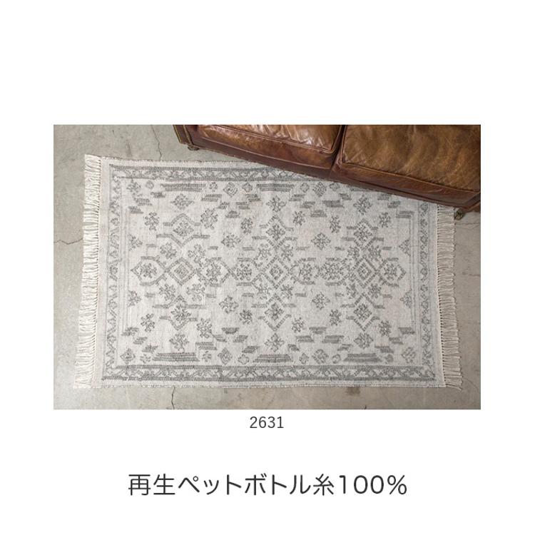 ・再生ペットボトルの糸を使用したインドキリムラグ。再生糸の柔らかさの幾何学模様やトライバルデザインは室内外でご使用可能。