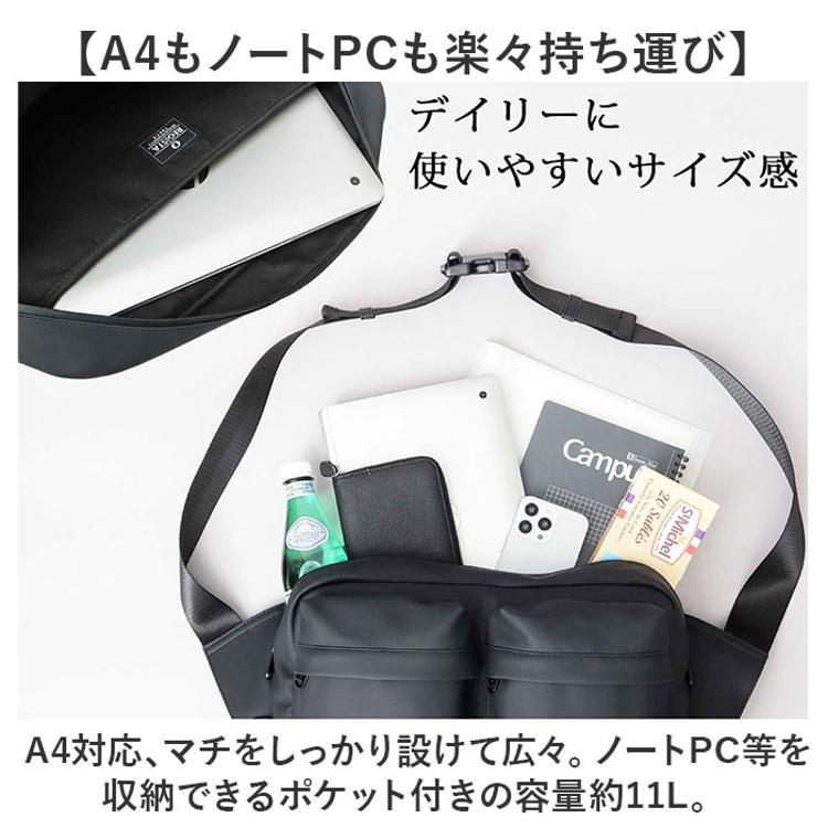 ・A4対応、マチをしっかり設けて広々。ノートPC等を収納できるポケット付きの容量約11L。