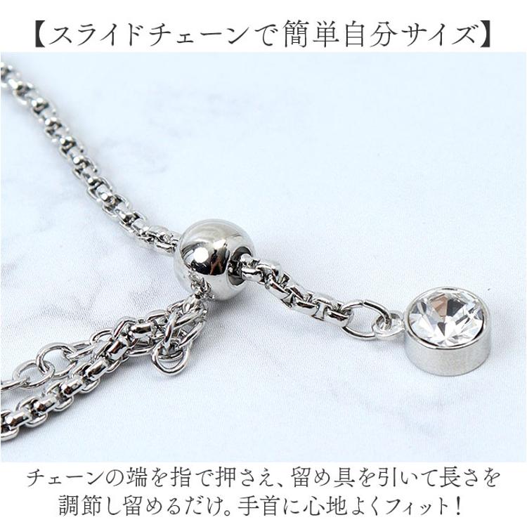 ・チェーンの端を指で押さえ、留め具を引いて長さを調節し留めるだけ。手首に心地よくフィット!