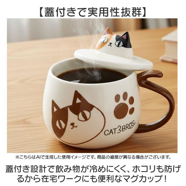 ・猫3兄弟の愛らしい顔が蓋を飾る磁器マグカップで、普段使いに大活躍。