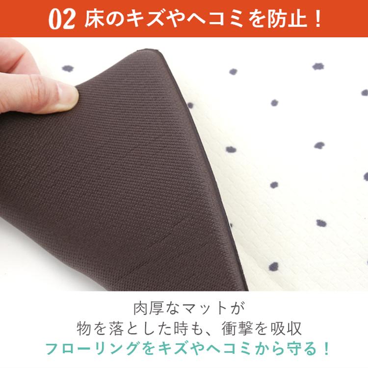 ・肉厚な6ミリ厚のマットが、万が一物をマットの上に落とした時も、衝撃を吸収!フローリングをキズやヘコミから守る。