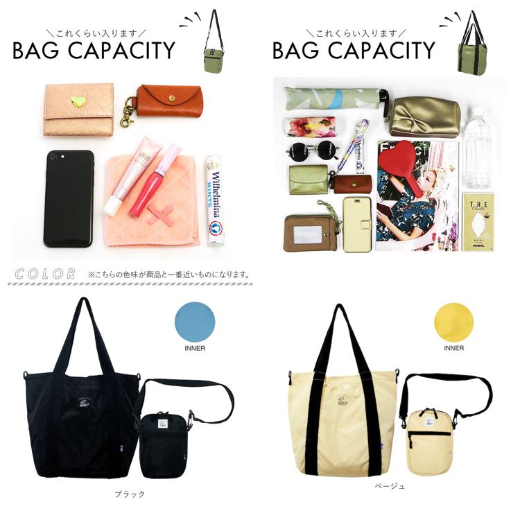 ・ミニショルダー(ポーチ部分):内側オープンポケット×1、前面ファスナーポケット×1、背面オープンポケット×1(トートバッグ収納用)