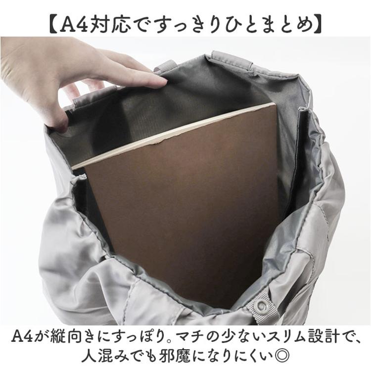 ・A4が縦向きにすっぽり。マチの少ないスリム設計で、人混みでも邪魔になりにくい◎