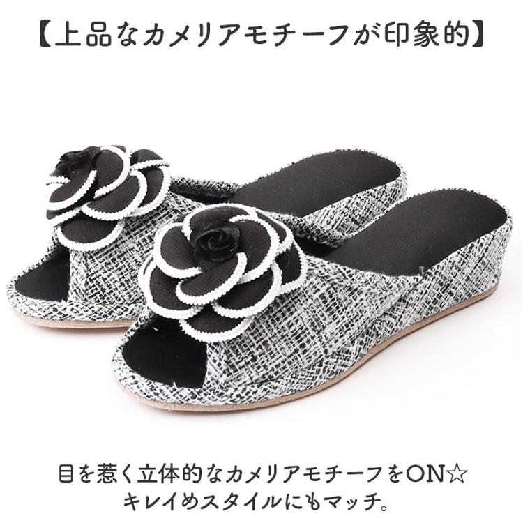 ・目を惹く立体的なカメリアモチーフをON☆キレイめスタイルにもマッチ。