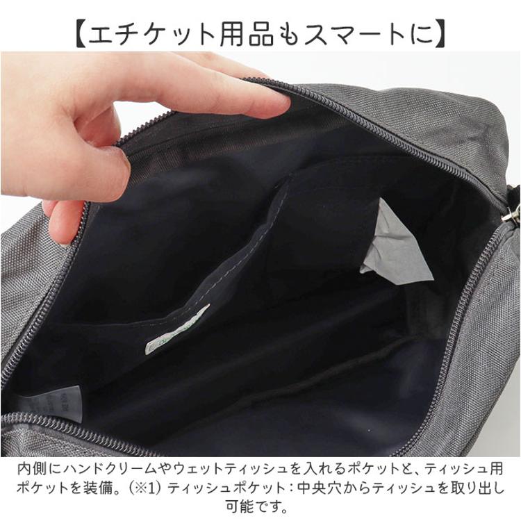 ・内側にハンドクリームやウェットティッシュを入れるポケットと、ティッシュ用ポケットを装備。