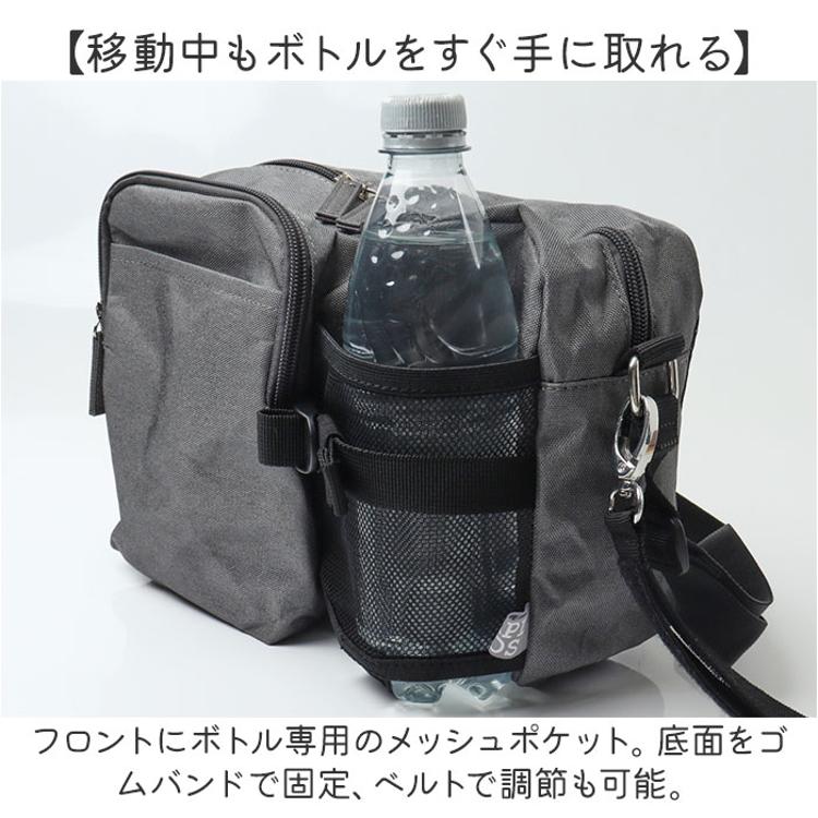 ・フロントにボトル専用のメッシュポケット。底面をゴムバンドで固定、ベルトで調節も可能。