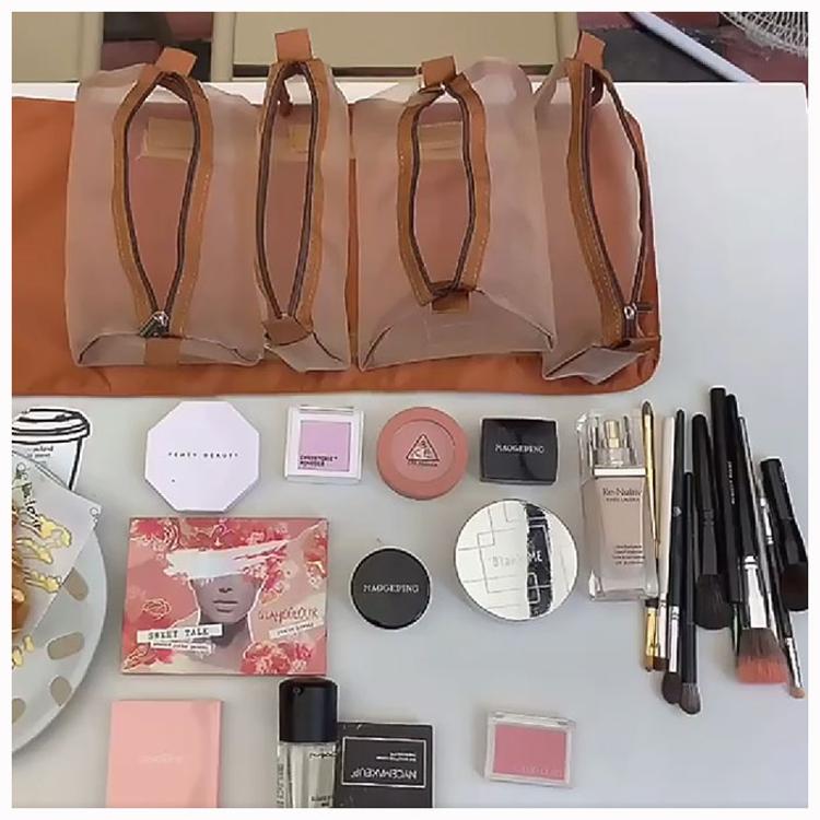 ・ワイドポーチには化粧水ボトルやスプレーがすっぽり。スリムポーチにはリップスティックやポリッシュ、コンパクトやメイクブラシなど細々としたツールを小分けにしておくのに便利。