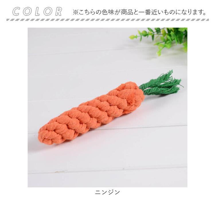 ・カラフルなコットンのロープを、ベジタブルやフルーツ、ワンちゃんのお気に入りのフードの形に編み込んで仕上げたドッグ用ロープトイ。素朴な雰囲気と優しい噛み応えにワンちゃん夢中。