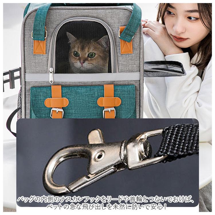 ・バッグの内側のナスカンフックをリードや首輪とつないでおけば、ペットの急な飛び出しを未然に防いで安心!