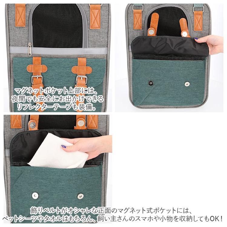 ・飾りベルトがオシャレな正面のマグネット式ポケットには、ペットシーツやタオルはもちろん、飼い主さんのスマホや小物を収納してもOK!