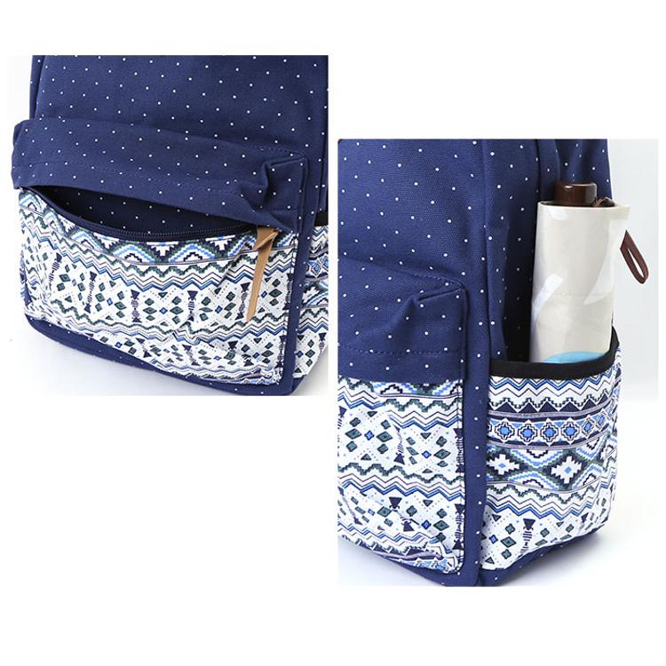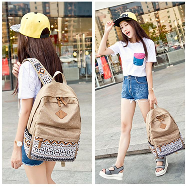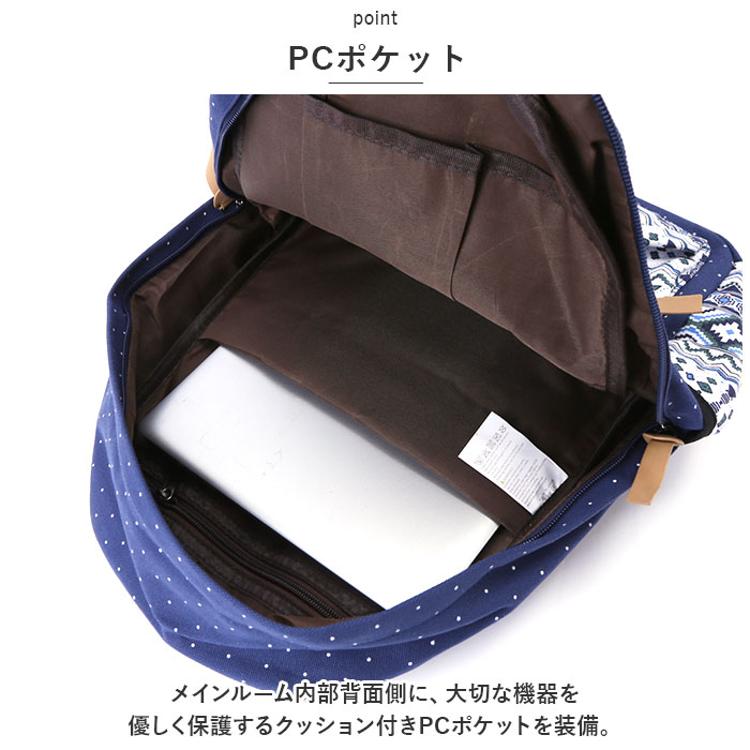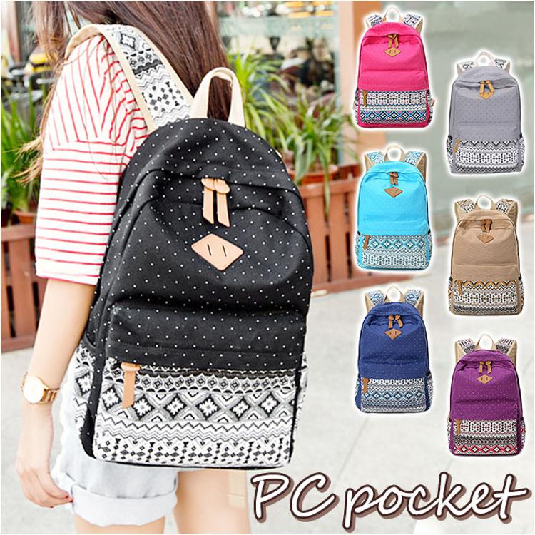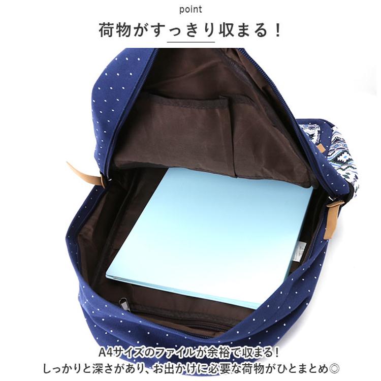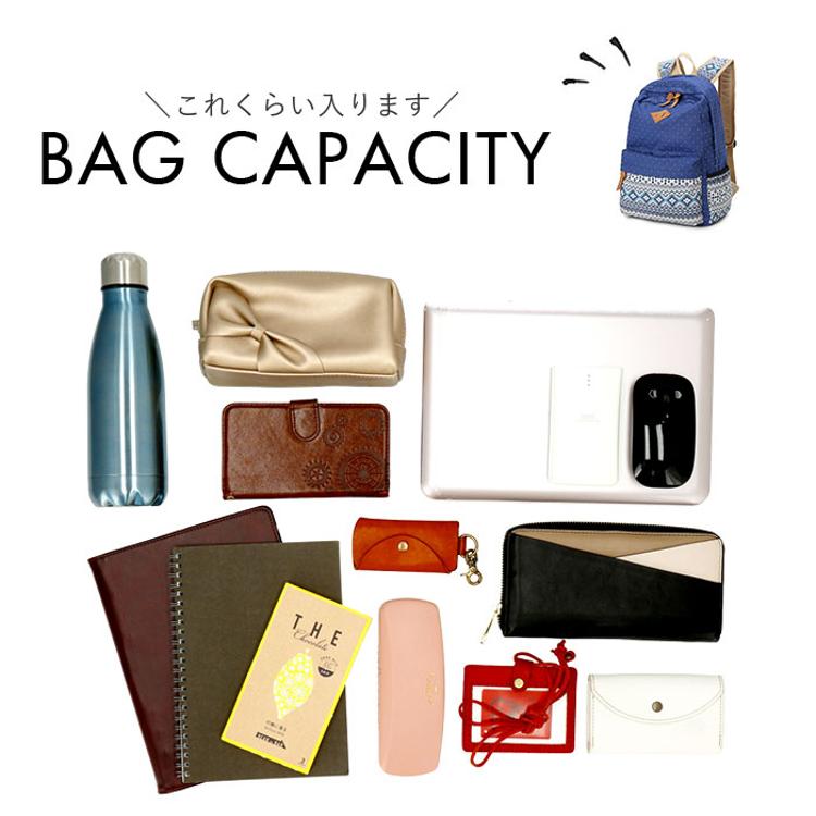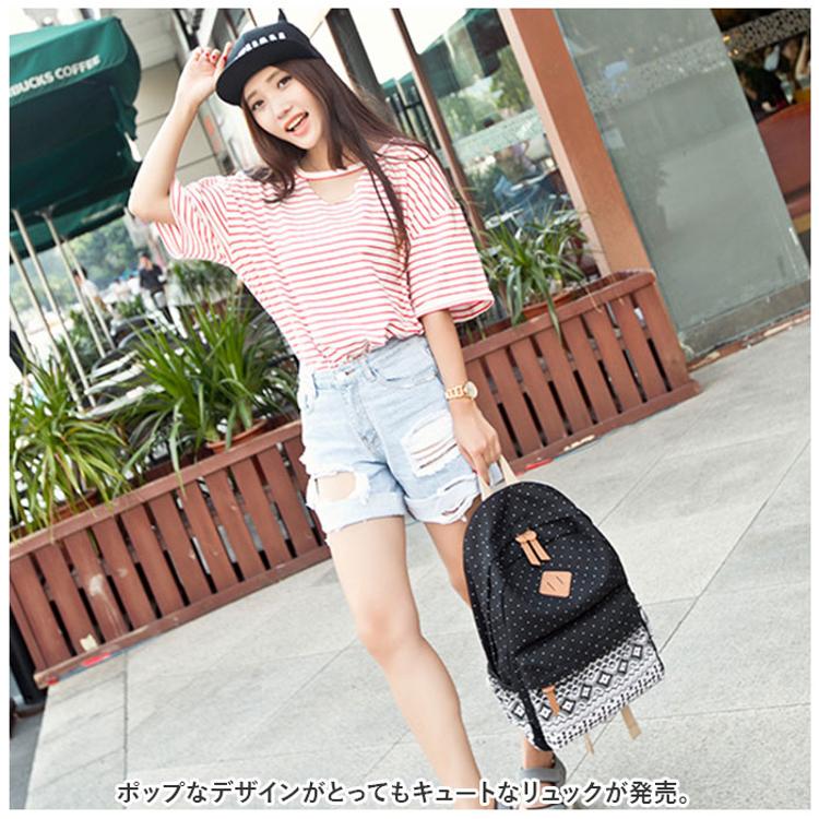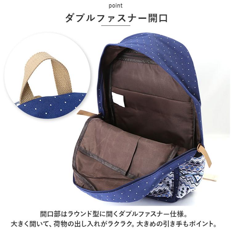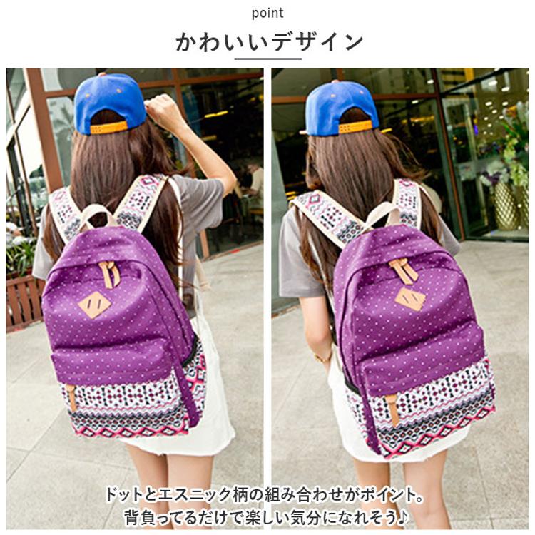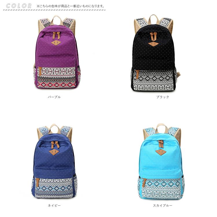・ドットとエスニック柄の組み合わせがポイント。背負ってるだけで楽しい気分になれそう♪