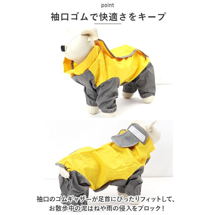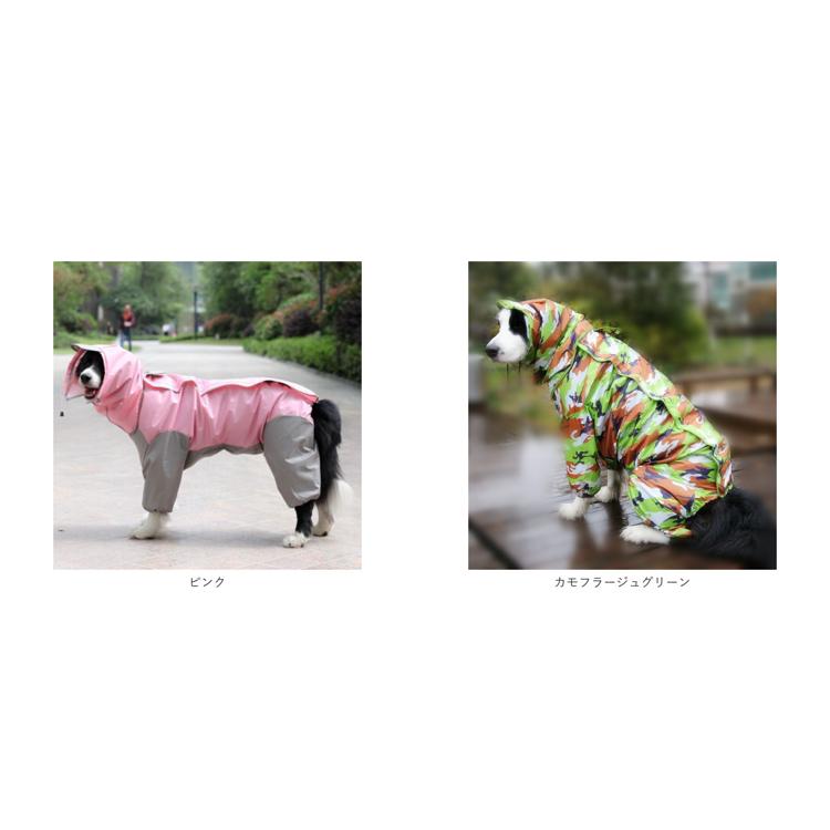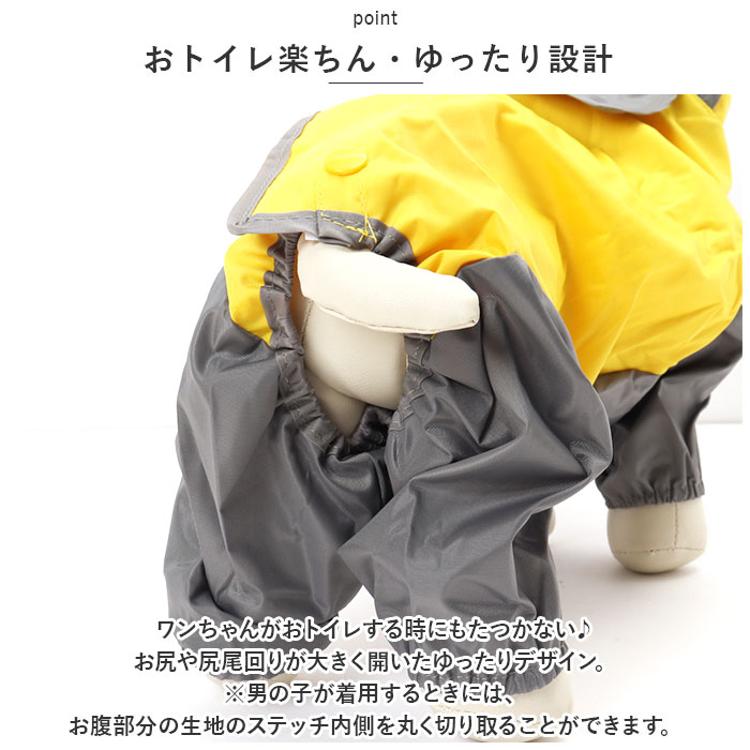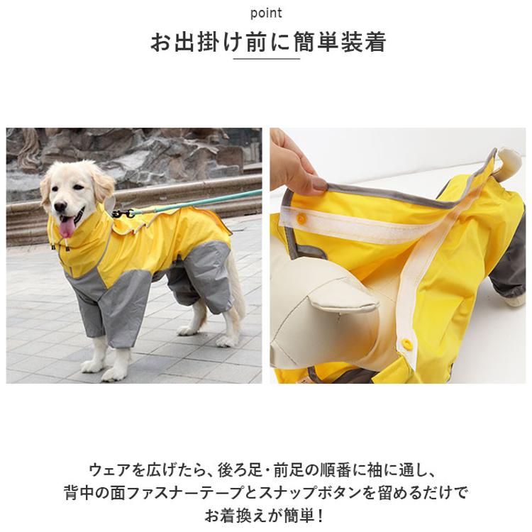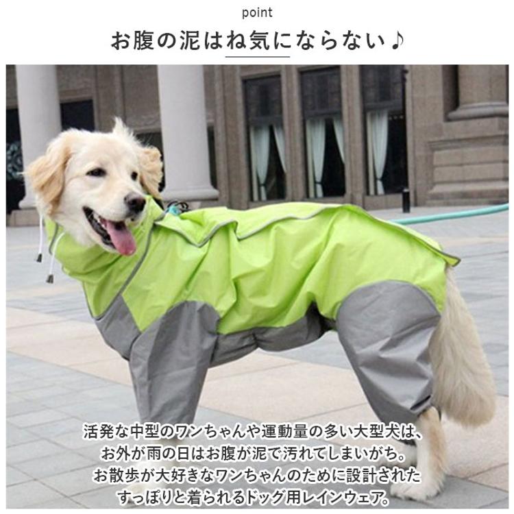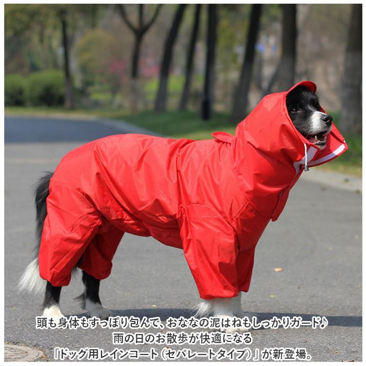 ・活発な中型のワンちゃんや運動量の多い大型犬は、お外が雨の日はお腹が泥で汚れてしまいがち。お散歩が大好きなワンちゃんのために設計されたすっぽりと着られるドッグ用レインウェア。