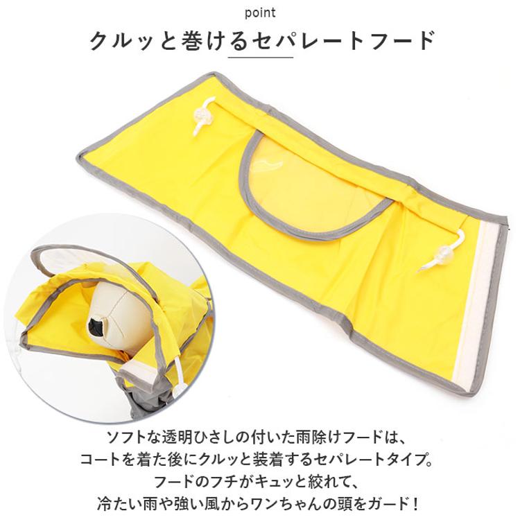 ・ソフトな透明ひさしの付いた雨除けフードは、コートを着た後にクルッと装着するセパレートタイプ。フードのフチがキュッと絞れて、冷たい雨や強い風からワンちゃんの頭をガード!