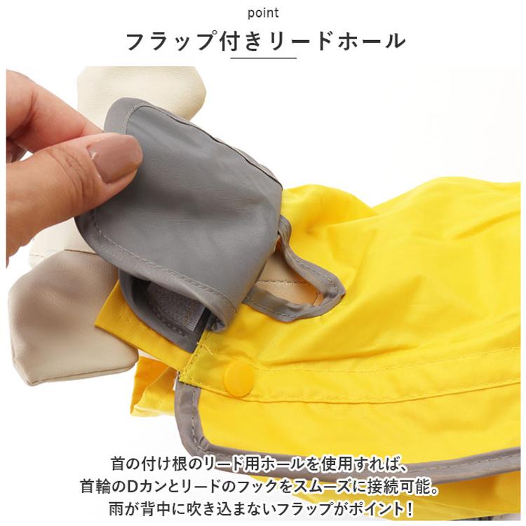 ・首の付け根のリード用ホールを使用すれば、首輪のDカンとリードのフックをスムーズに接続可能。雨が背中に吹き込まないフラップがポイント!