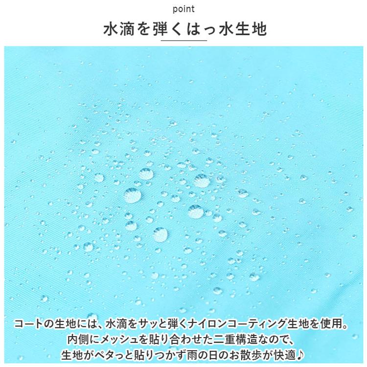 ・コートの生地には、水滴をサッと弾くナイロンコーティング生地を使用。内側にメッシュを貼り合わせた二重構造なので、生地がペタっと貼りつかず雨の日のお散歩が快適♪