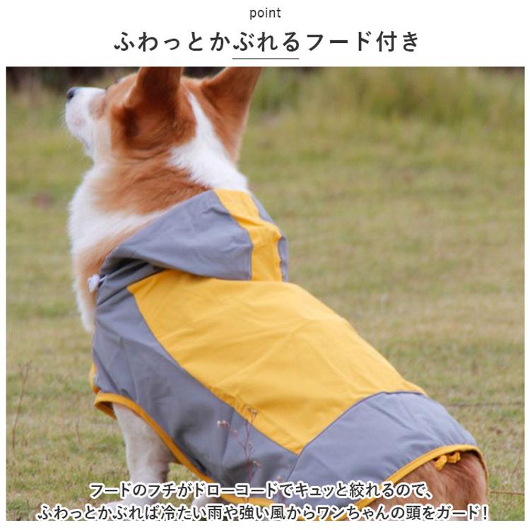 ・フードのフチがドローコードでキュッと絞れるので、ふわっとかぶれば冷たい雨や強い風からワンちゃんの頭をガード!