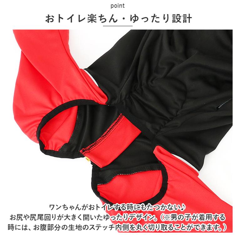 ・ワンちゃんがおトイレする時にもたつかない♪お尻や尻尾回りが大きく開いたゆったりデザイン。(※男の子が着用するときには、お腹部分の生地のステッチ内側を丸く切り取ることができます。)