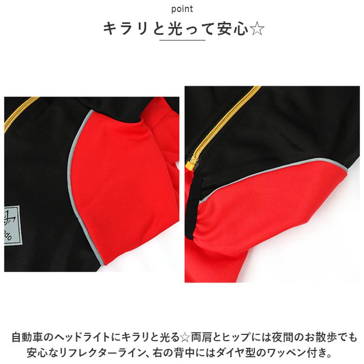 ・自動車のヘッドライトにキラリと光る☆両肩とヒップには夜間のお散歩でも安心なリフレクターライン、右の背中にはダイヤ型のワッペン付き。