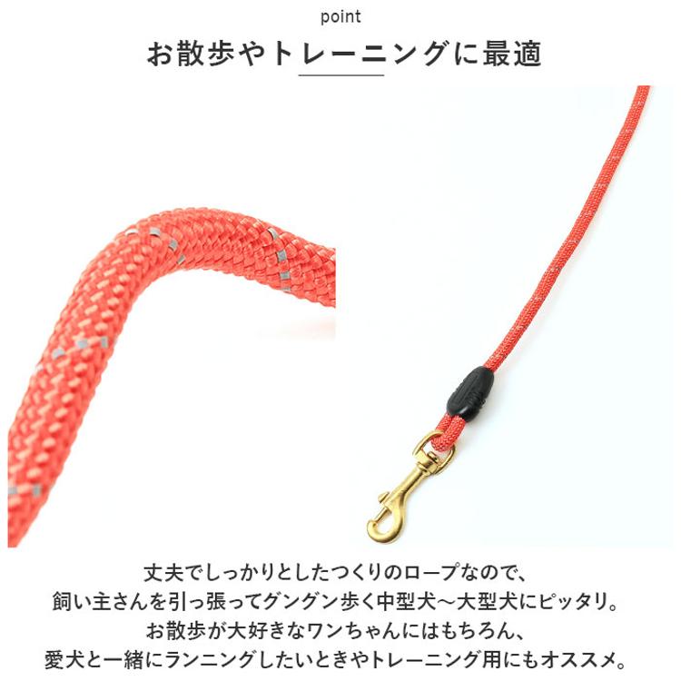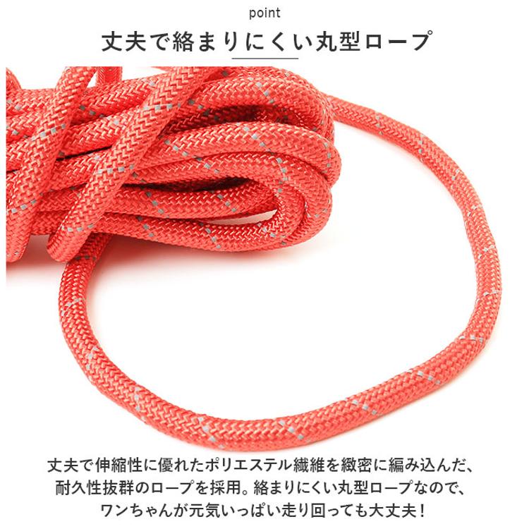 ・丈夫で伸縮性に優れたポリエステル繊維を緻密に編み込んだ、耐久性抜群のロープを採用。絡まりにくい丸型ロープなので、ワンちゃんが元気いっぱい走り回っても大丈夫!