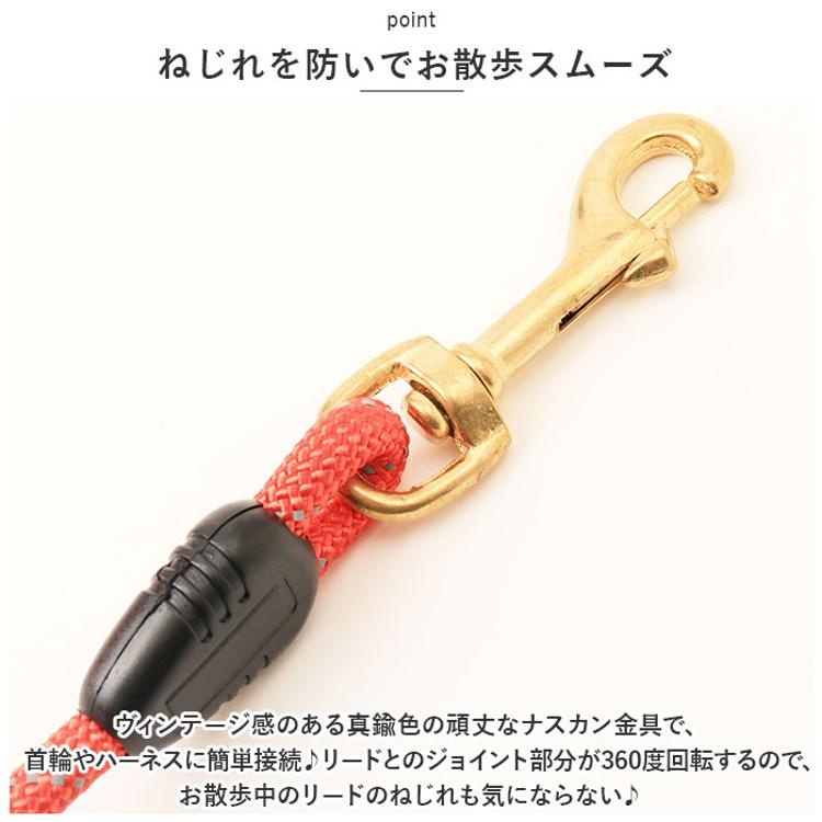 ・ヴィンテージ感のある真鍮色の頑丈なナスカン金具で、首輪やハーネスに簡単接続♪リードとのジョイント部分が360度回転するので、お散歩中のリードのねじれも気にならない♪