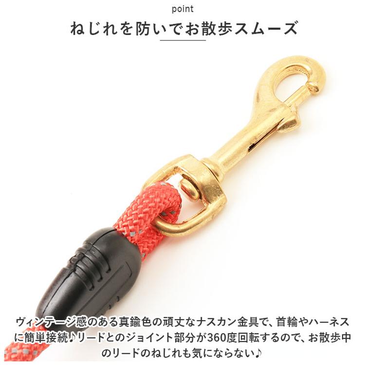 ・ヴィンテージ感のある真鍮色の頑丈なナスカン金具で、首輪やハーネスに簡単接続♪リードとのジョイント部分が360度回転するので、お散歩中のリードのねじれも気にならない♪