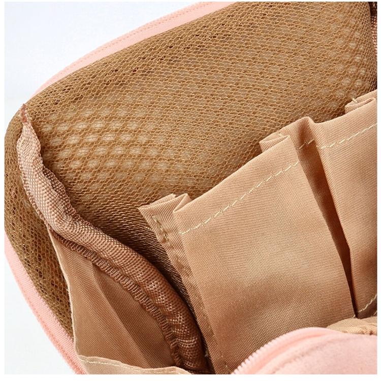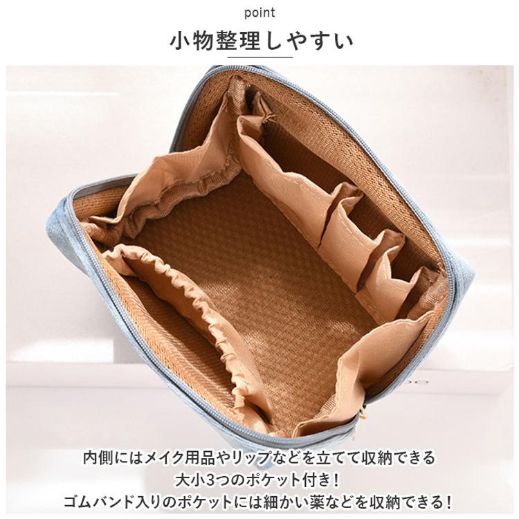 ・内側にはメイク用品やリップなどを立てて収納できる大小3つのポケット付き!ゴムバンド入りのポケットには細かい薬などを収納できる!