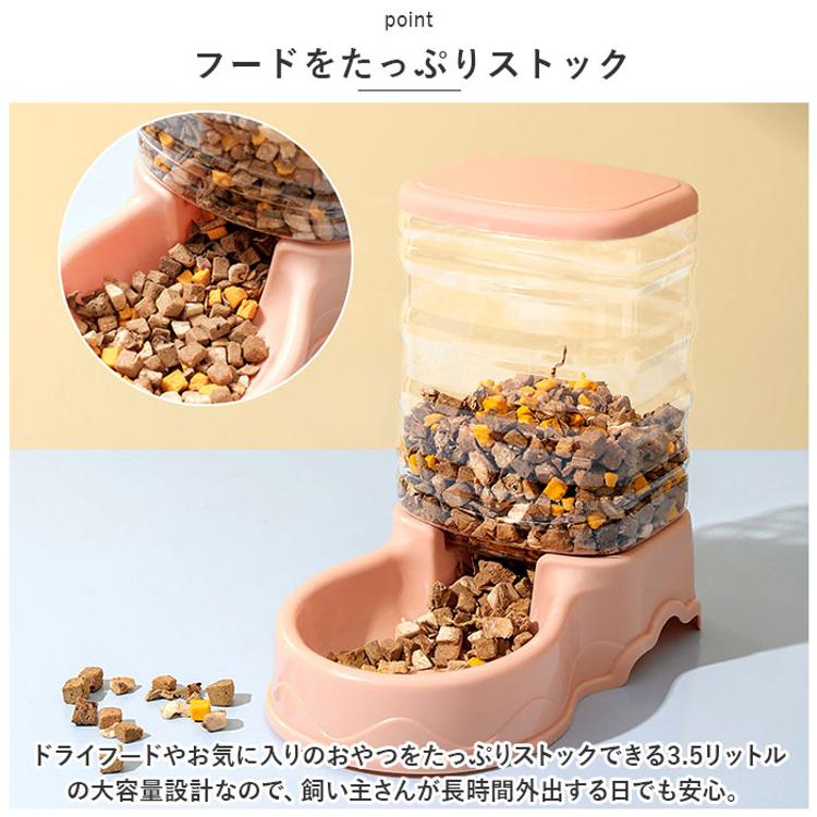 ・ドライフードやお気に入りのおやつをたっぷりストックできる3.5リットルの大容量設計なので、飼い主さんが長時間外出する日でも安心。