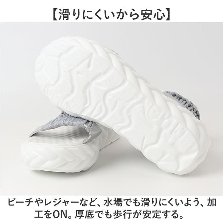 ・ビーチやレジャーなど、水場でも滑りにくいよう、加工をON。厚底でも歩行が安定する。