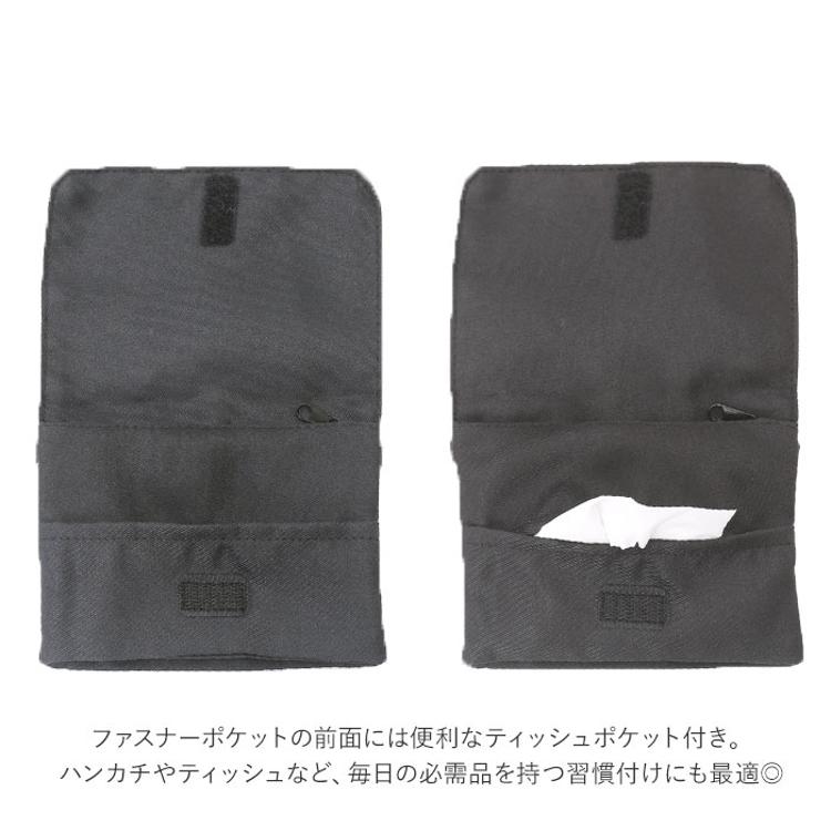 ・ファスナーポケットの前面には便利なティッシュポケット付き。