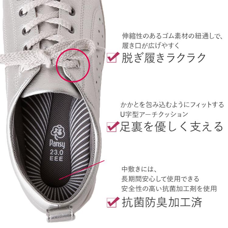 ・中敷きには、安全性が高く長期間安心して使用できるパンジーの抗菌防臭加工が施されている。