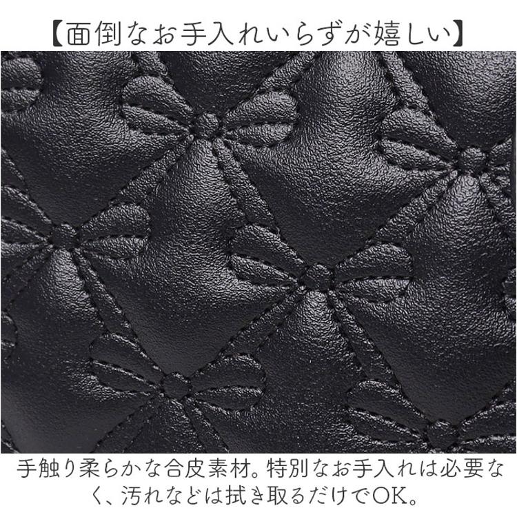 ・表面にはステッチで、刺繍のようにリボンを表現。ハンドル下には、立体ハートもさりげなく♪