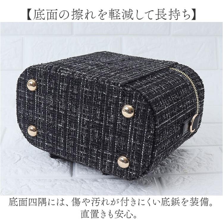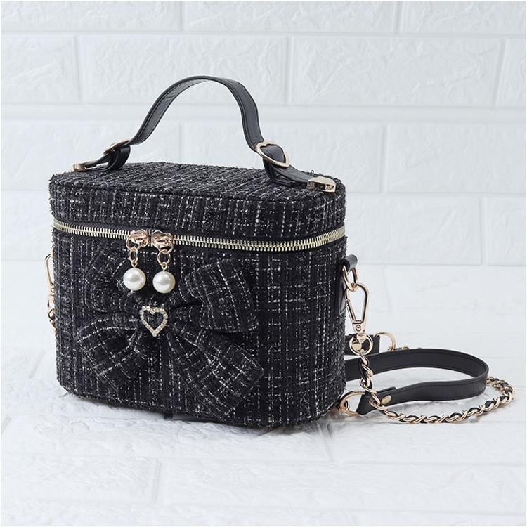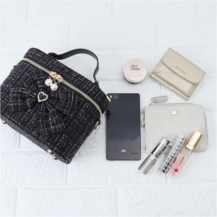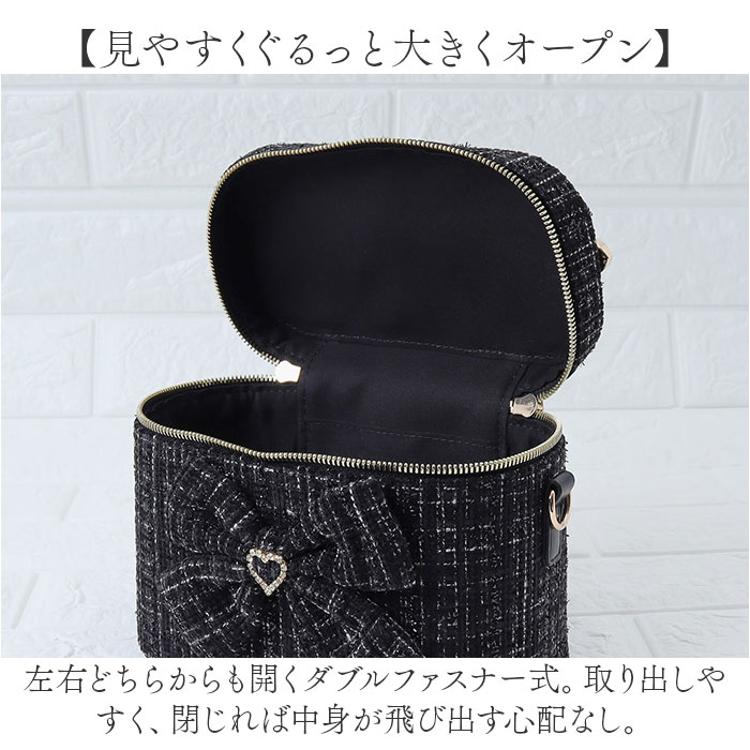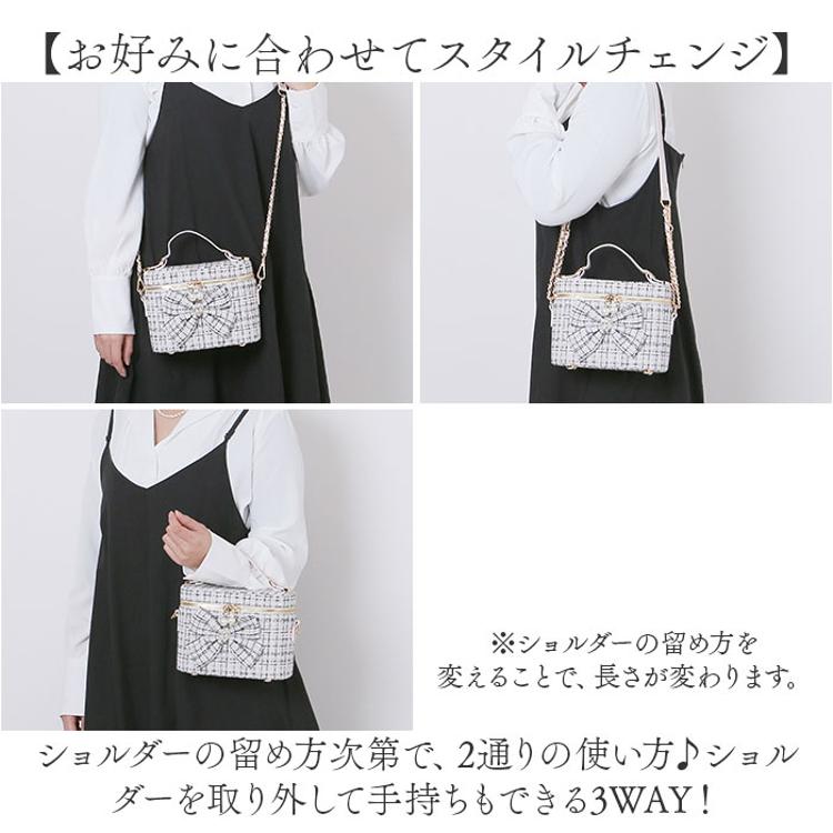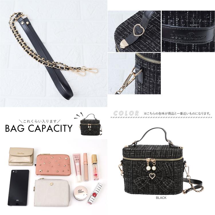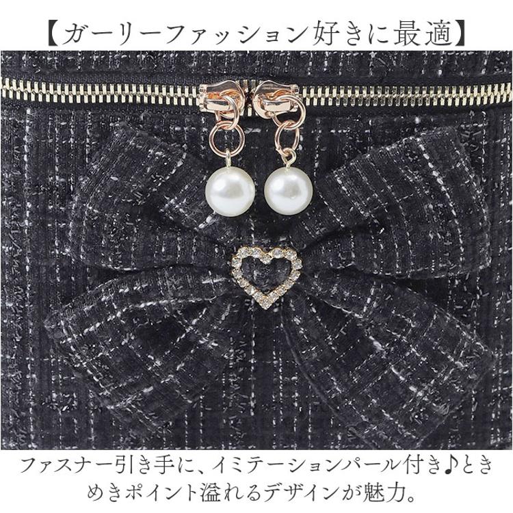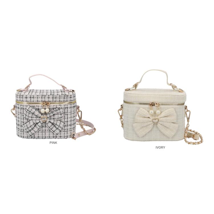 ・温かみのあるツイード素材仕上げ。大きなリボンの中心には、ハートのビジューをON♪