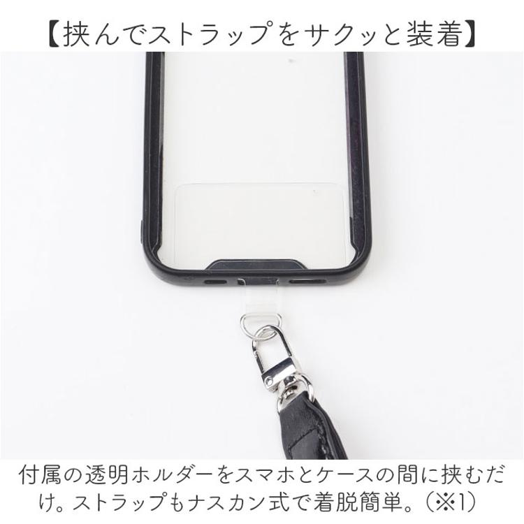 ・付属の透明ホルダーをスマホとケースの間に挟むだけ。ストラップもナスカン式で着脱簡単。