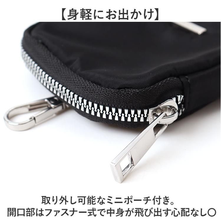 ・取り外し可能なミニポーチ付き。開口部はファスナー式で中身が飛び出す心配なし〇