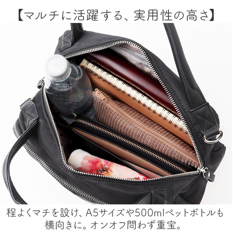 ・程よくマチを設け、A5サイズや500mlペットボトルも横向きに。オンオフ問わず重宝。